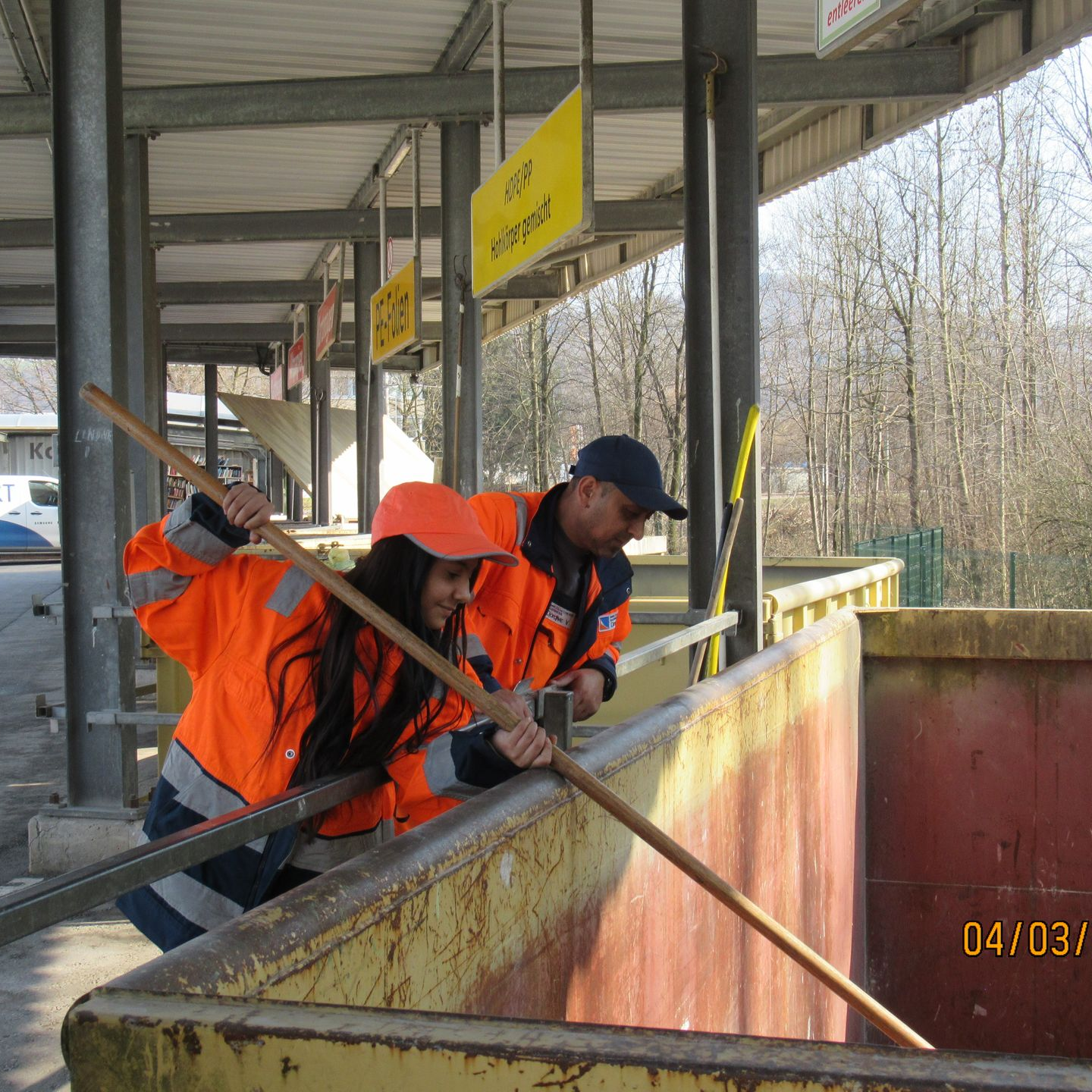 Im Zuge der Aktion „Ein Tag am Arbeitsplatz der Eltern“ verbrachte Sofia Djordjevic einen Tag Seite an Seite mit ihrem Vater und unterstützte ihn tatkräftig bei seiner Arbeit. Vladan Djordjevic ist bereits seit vielen Jahren Teil unseres Teams und achtet penibel darauf, dass die Besucher des Recyclinghofes beim Trennen ihrer Abfälle alles richtig machen. Dass es dabei auch stressig zugehen kann, bekam Sofia hautnah mit. Ihren Arbeitsalltag hat sie in einem Bericht auch schriftlich festgehalten. (siehe Bild in der Mitte).
